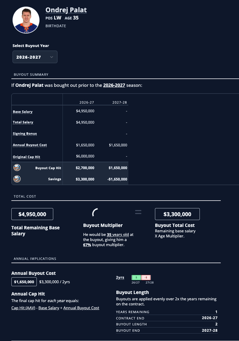 Ondrej Palat is the interesting one. While Darche showed loyalty to the grizzled veteran when he acquired him from the New Jersey Devils, Palat struggled in the Islanders’ lineup, eventually being scratched in a must-win game that the Islanders lost. He has one more season left ($6M AAV), and there is no way to move on from him without attaching a pick, as New Jersey did. A buyout makes sense here if he’s not going to be playing on the club’s fourth line this fall.