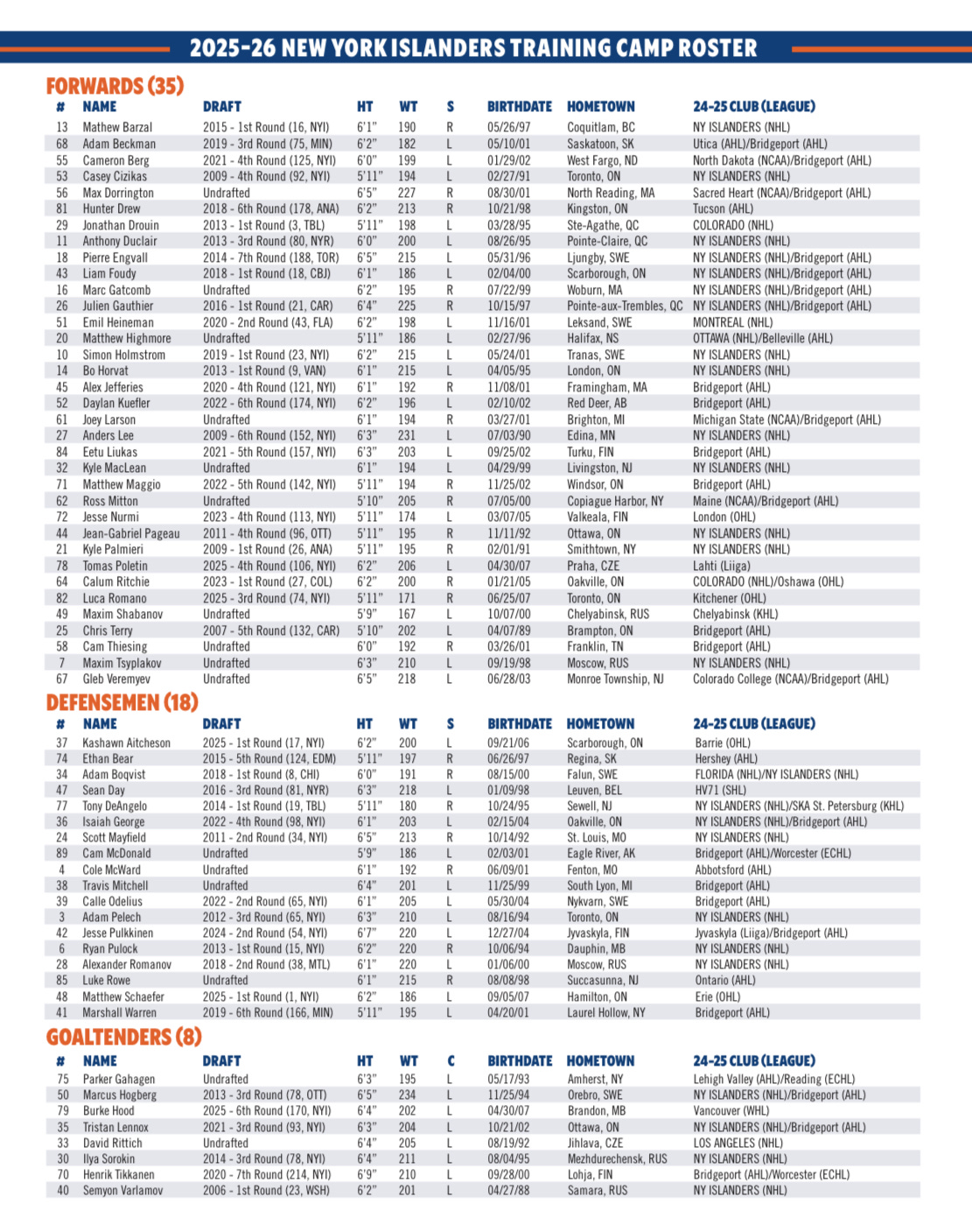 The New York Islanders open their 2025-26 training camp with 61 players.